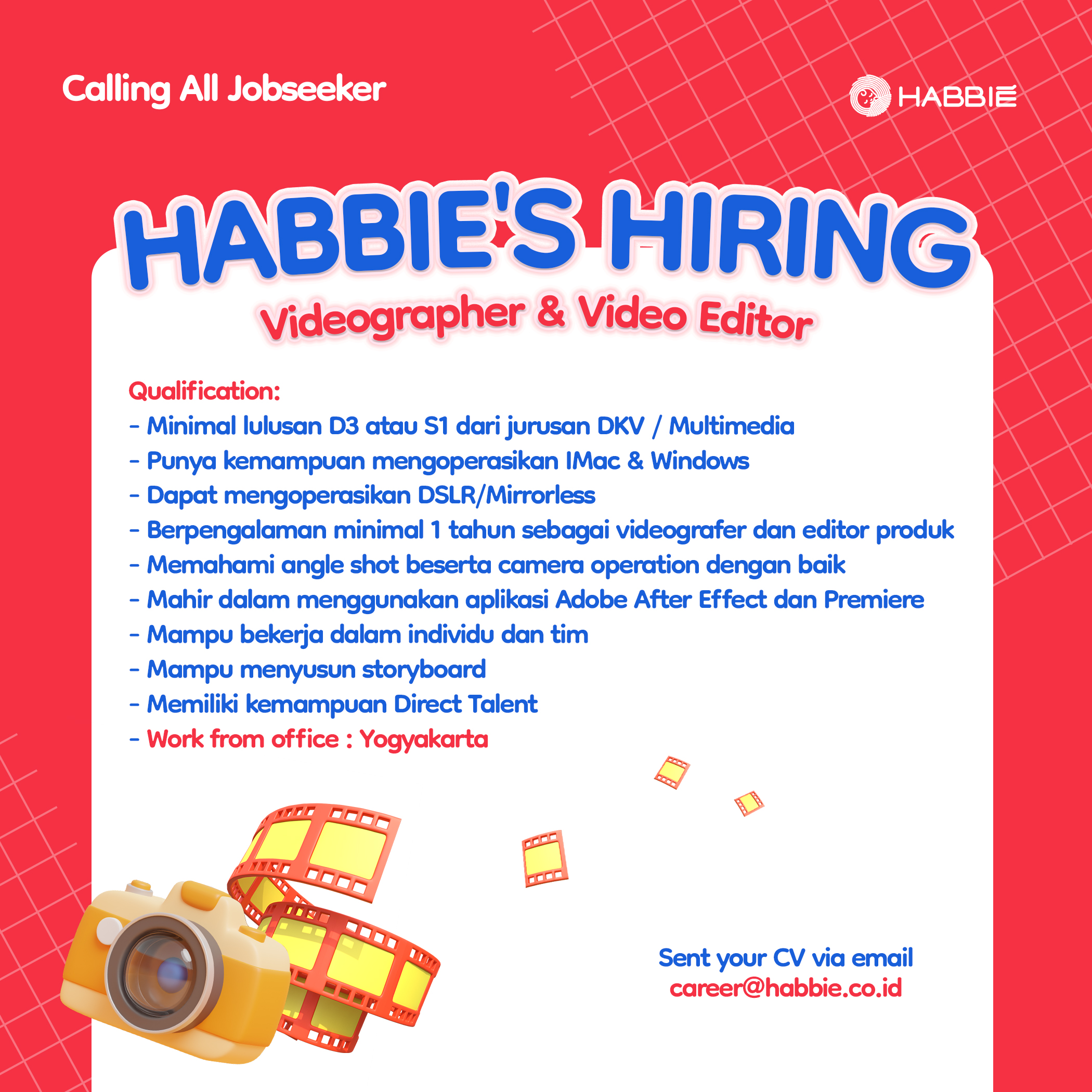 Saat ini Habbie tengah mencari kandidat untuk posisi Videografer dan Video Editor. kirimkan CV terbaru Anda di alamat email career@habbie.co.id dengan subjek “(Posisi yang dilamar) - (Nama Anda).