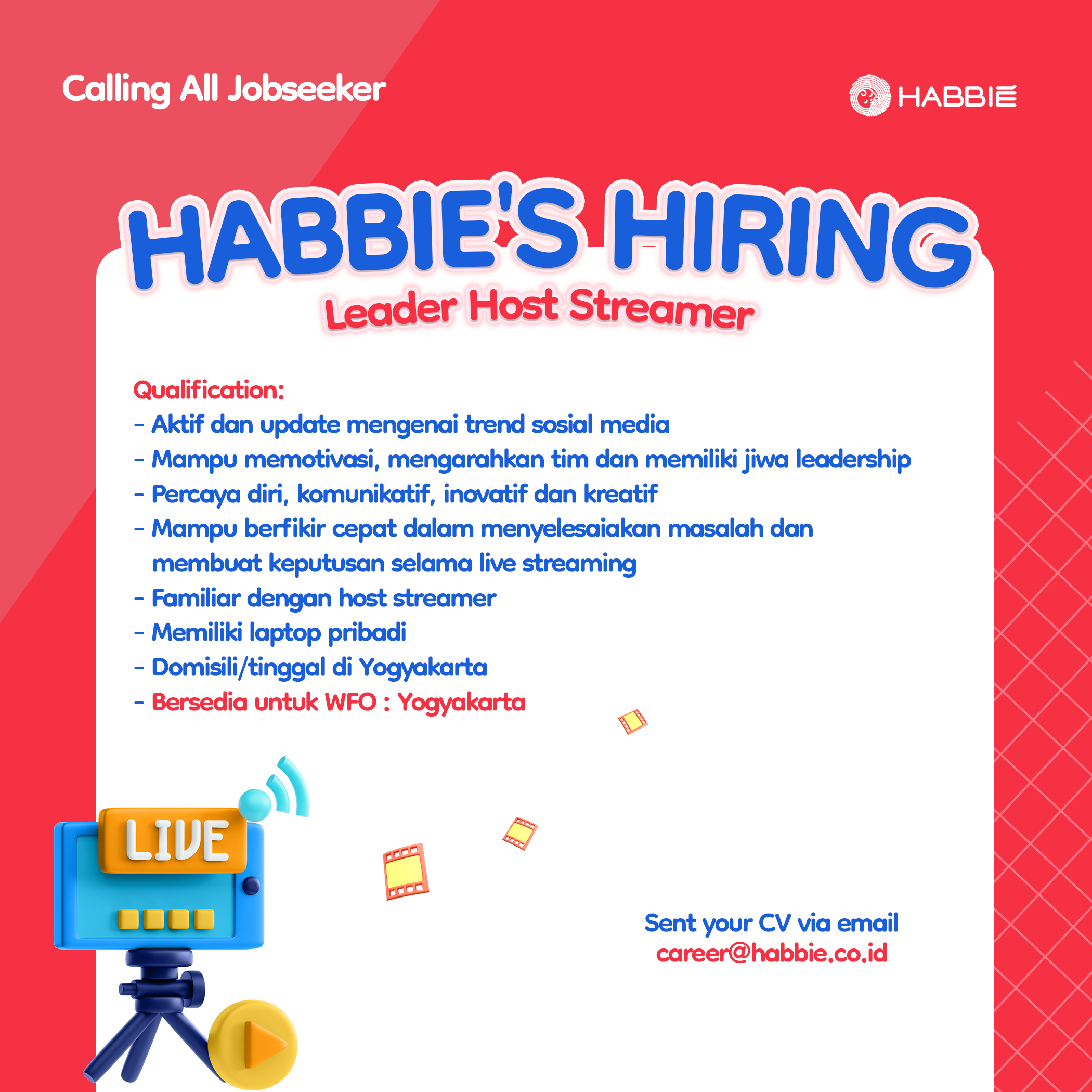 Saat ini kami tengah mencari kandidat untuk posisi Leader Host Streamer. Kirimkan CV terbaru Anda di alamat email career@habbie.co.id dengan subjek “(Posisi yang dilamar) - (Nama Anda).